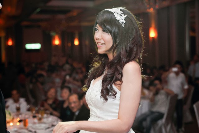 然後是二進發小禮物跟敬酒的造型, 這套粉色的晚禮服, 葳葳幫我挽了一個側邊髻,
