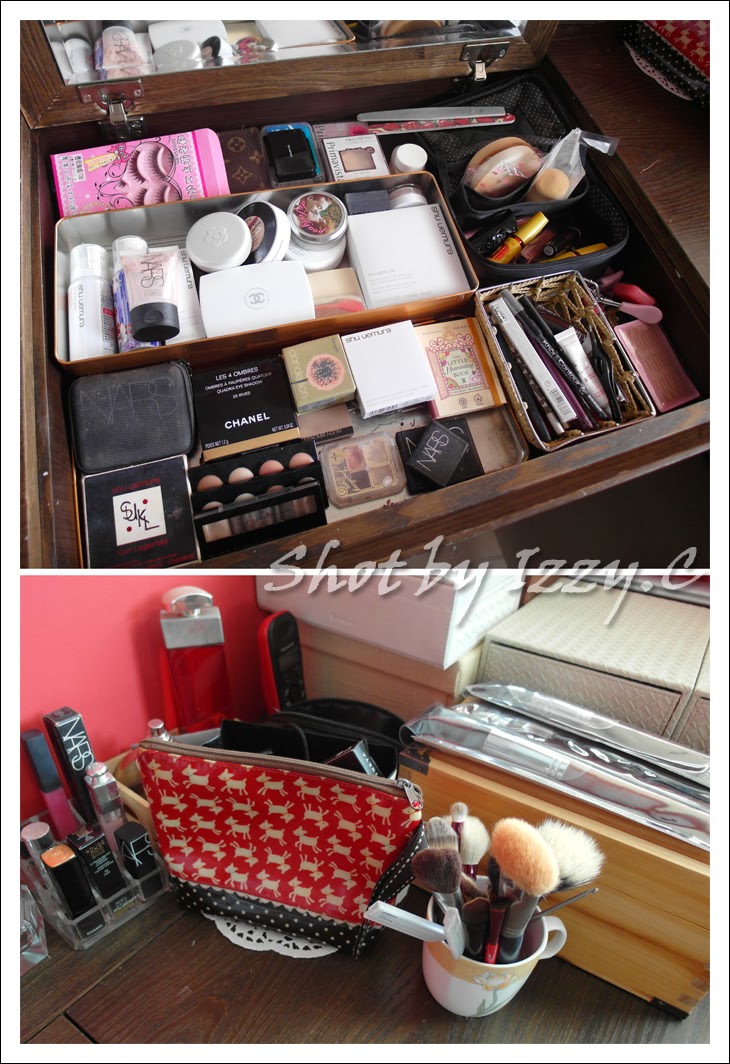 刷具/化妝包跟唇妝類完全塞不下, 只好用杯子/架子裝起來放在桌面,