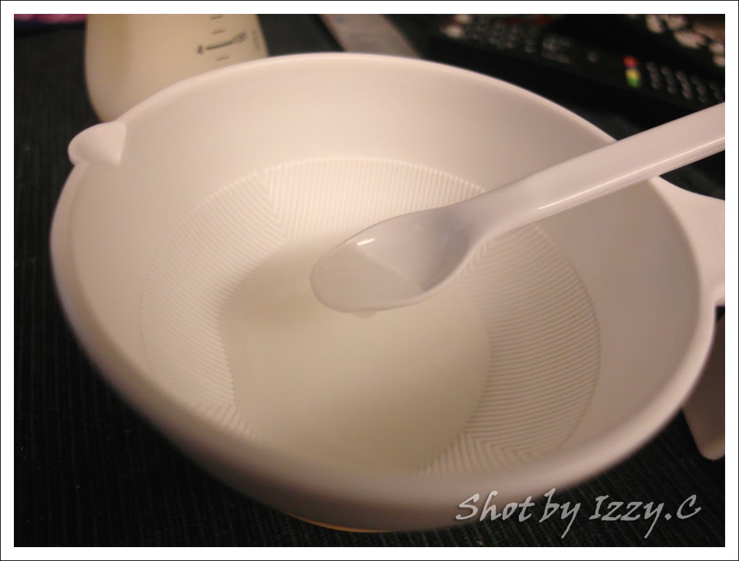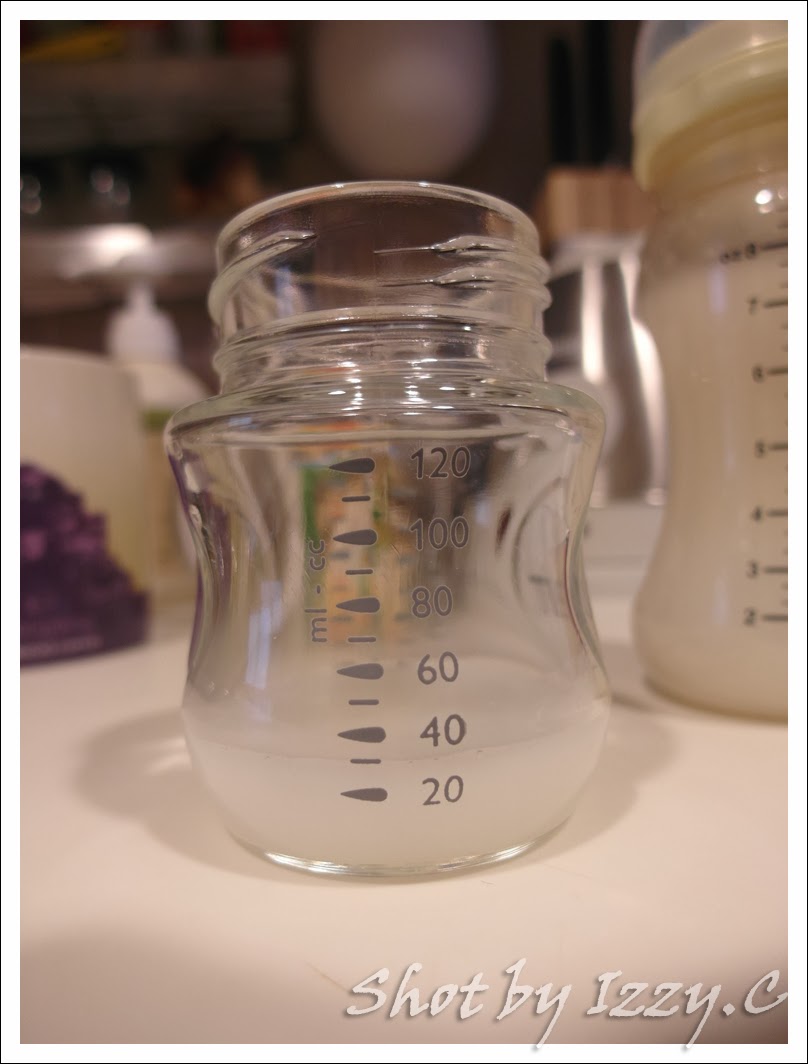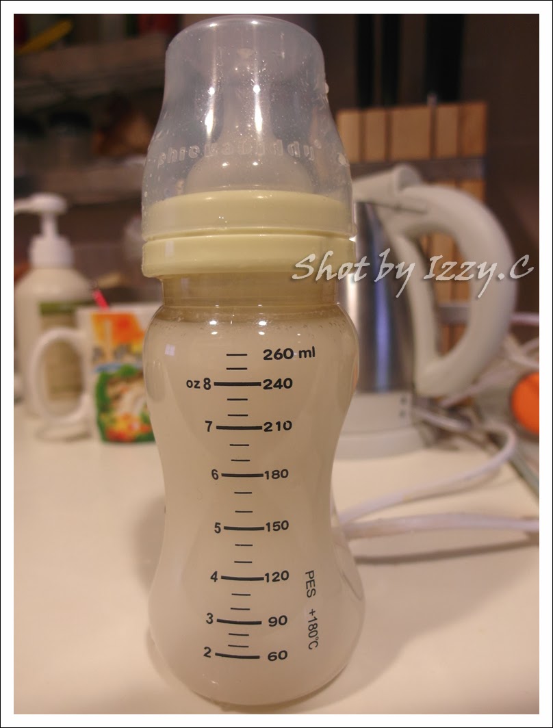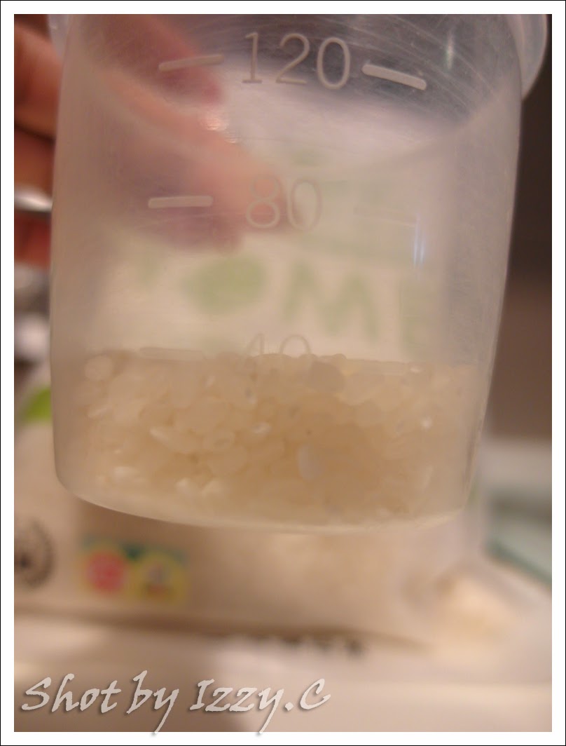 前面兩天因為要讓蕎蕎習慣米糊的味道, 所以我都是混母奶. (我貪懶, 直接放進微波爐加熱20秒至微溫狀態, 再倒入溫好的母奶)