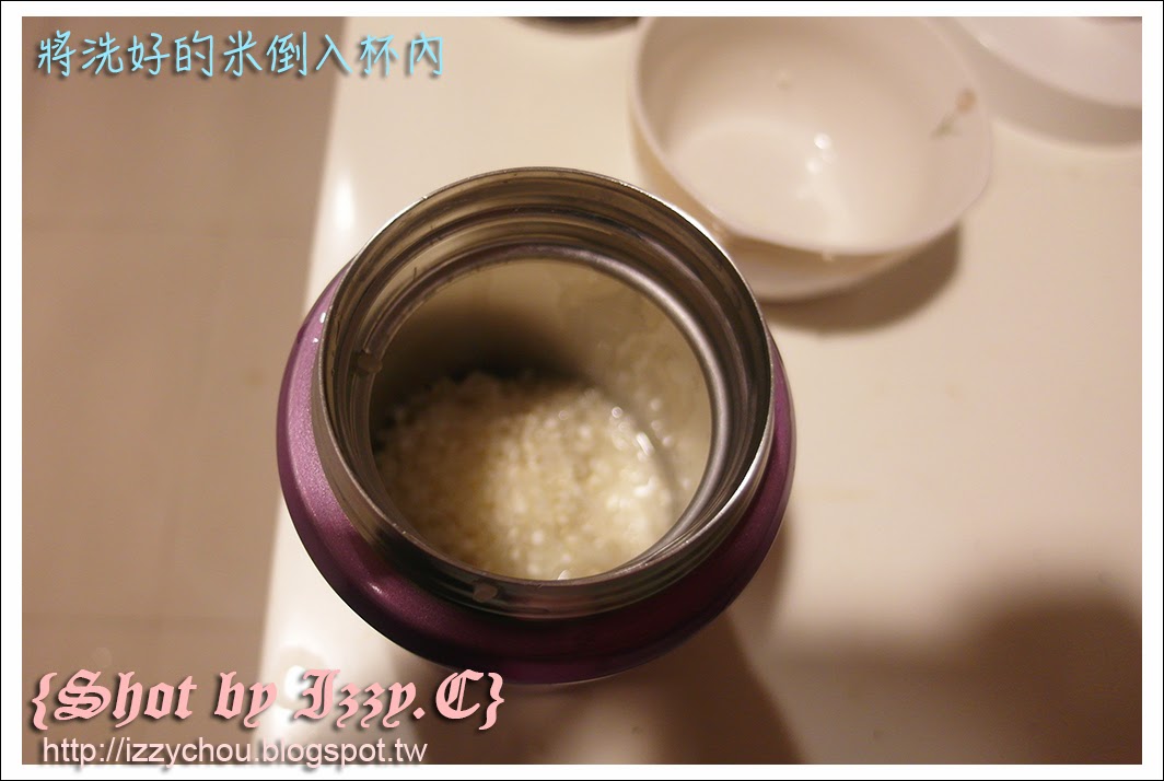 將燜燒罐裡的熱水倒掉,加入剛剛已經洗好的米—