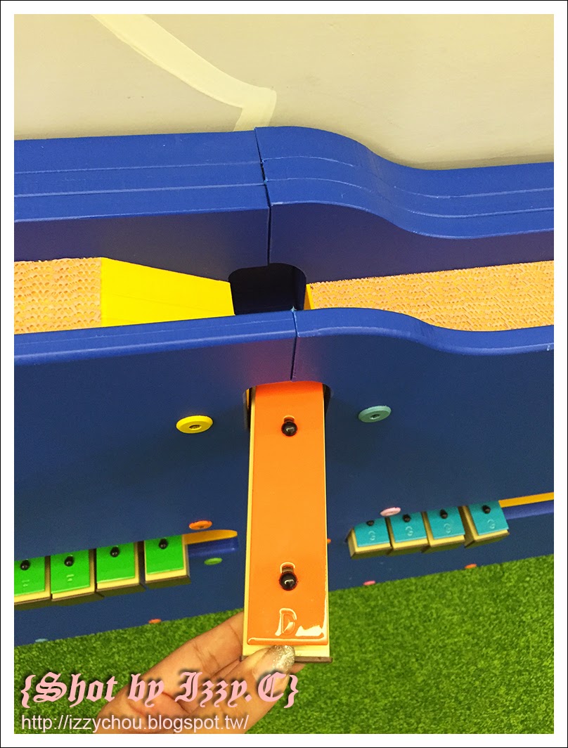 除了有自己敲打的樂器,還有利用物理原理,丟球就可以隨軌道敲擊樂器發出聲音,