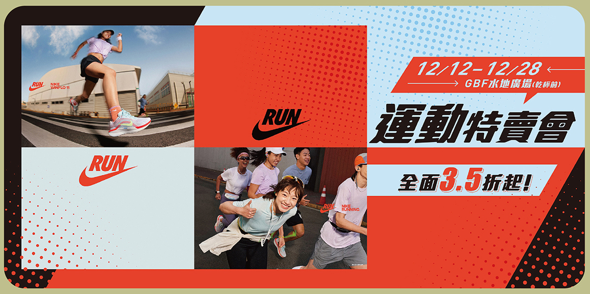 12/12~12/28,在GBF水池廣場旁邊會有NIKE的運動特賣會,3.5折超優惠!記得要去看看喔~