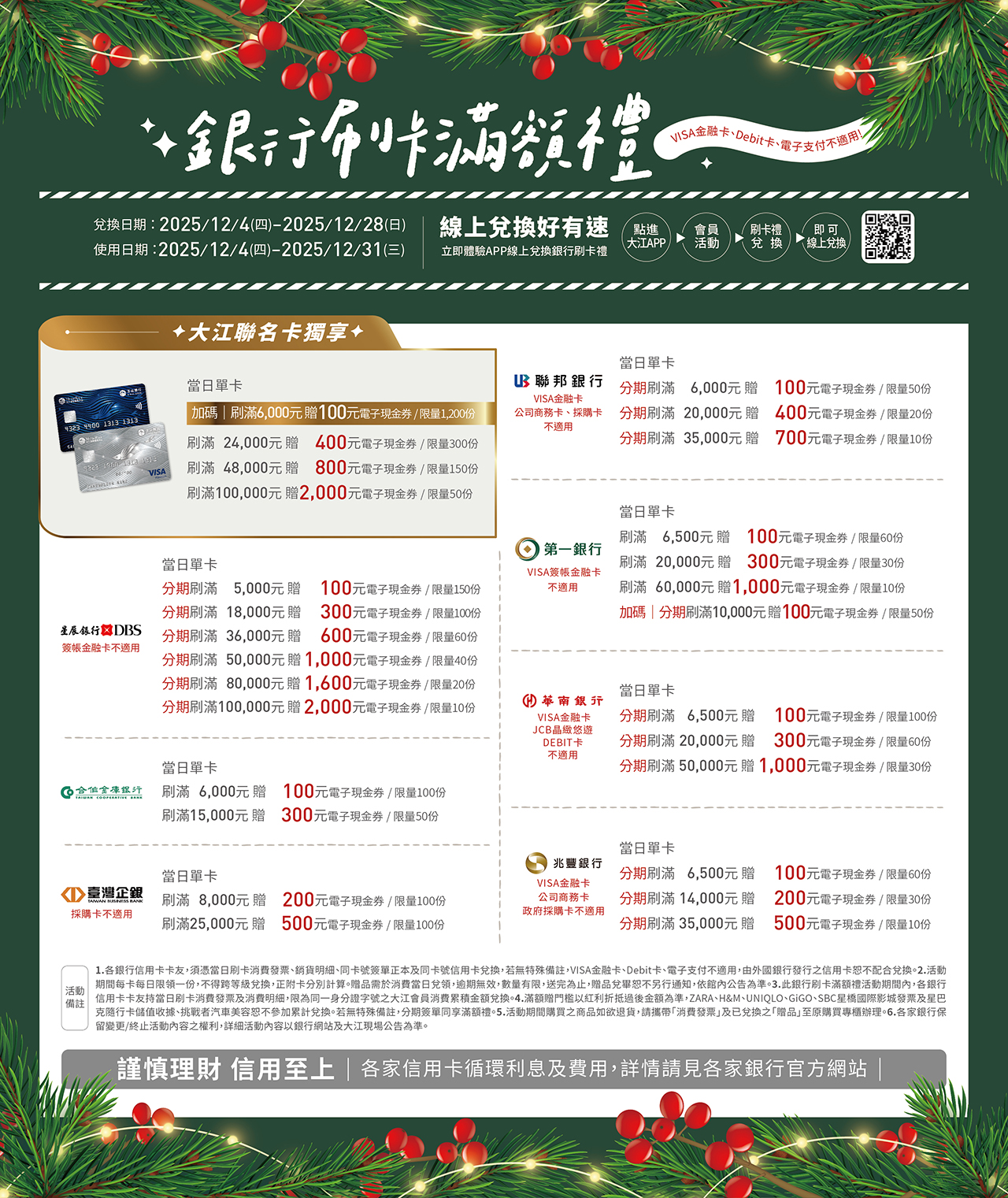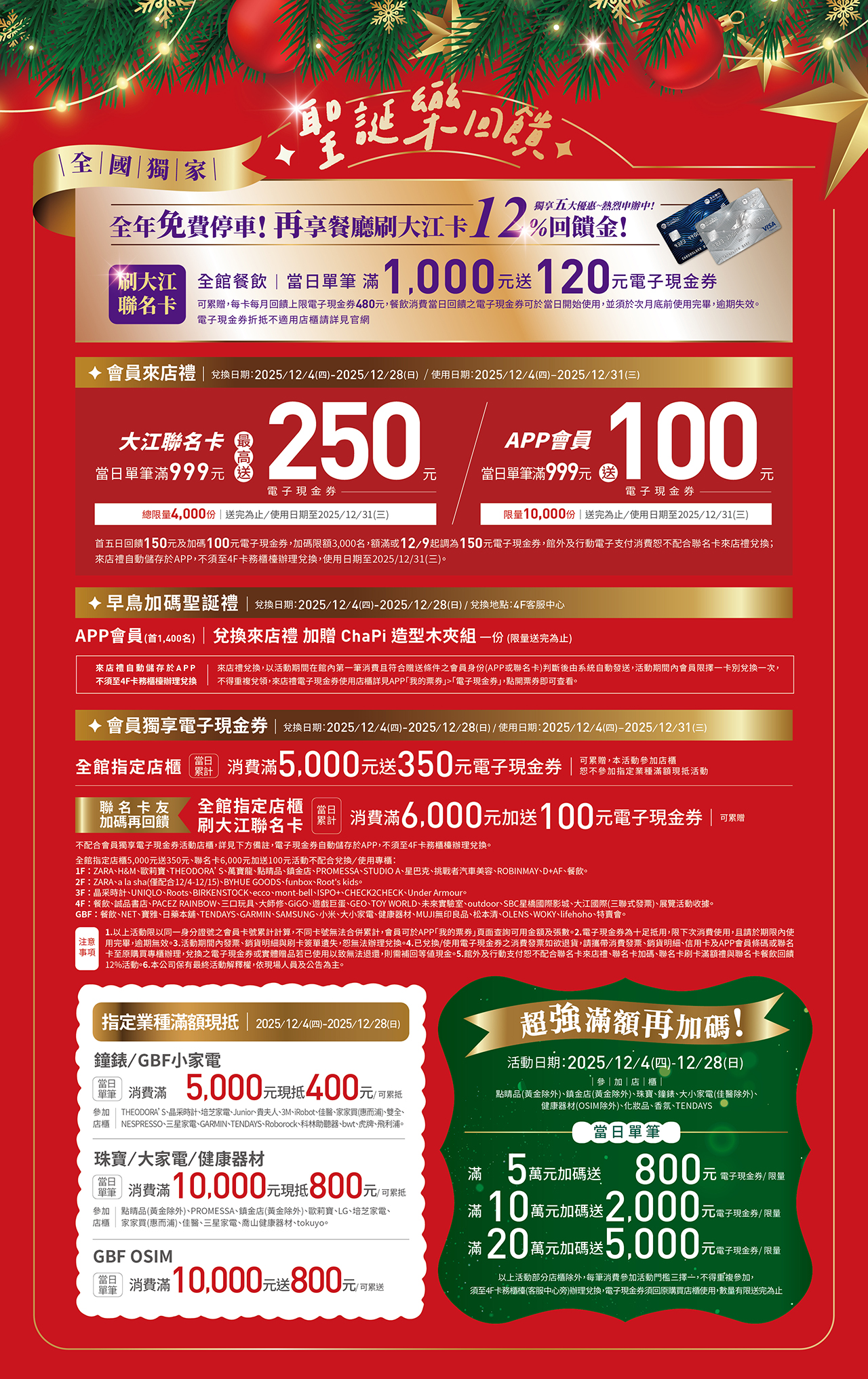 12/4~12/28,聖誕樂回饋有多重購物好禮,刷大江卡回饋更是高達12%!